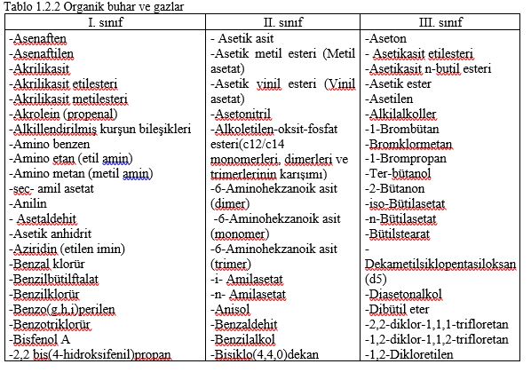 Organik Buhar ve Gaz Emisyonları için sınır değerleri (Tablo 1.2.2)